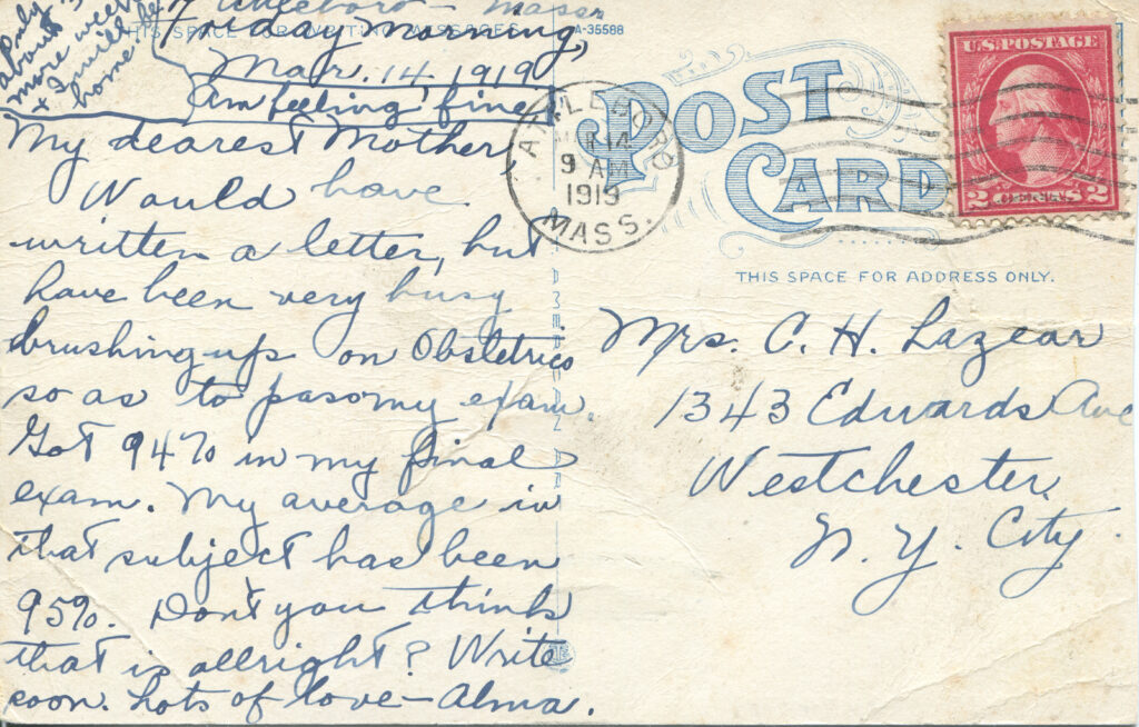 I would have written a letter, but have been very busy brushing up on Obstetrics so as to pass my exam. Got 94% in my final exam. My average in that subject has been 95%. Don’t you think that is all right? Write soon. Lots of love – Alma.