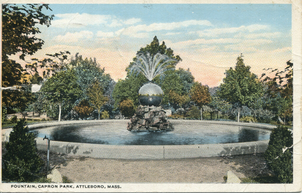 Context: Main Image: The postcard features a colorized illustration of a fountain in Capron Park, Attleboro, Massachusetts, set against a backdrop of lush greenery and a serene sky.