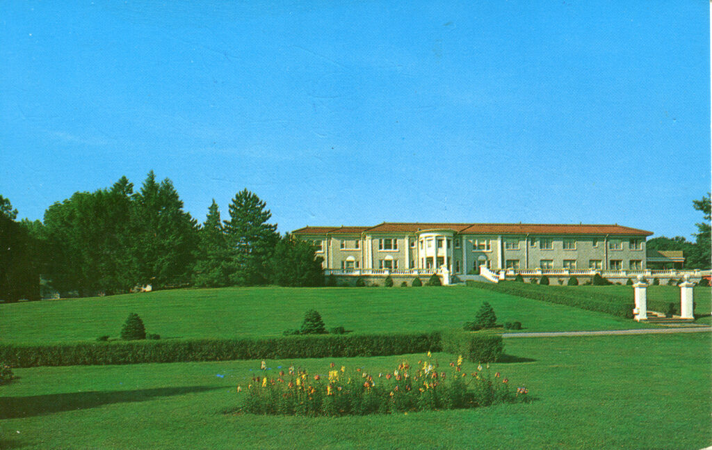 - Main Image: The postcard features a large, elegant building situated on an expansive, well-manicured lawn. The architecture of the building suggests a classical style with columns and a symmetrical facade. The building appears to be a mansion or possibly an institutional building such as a university or museum.