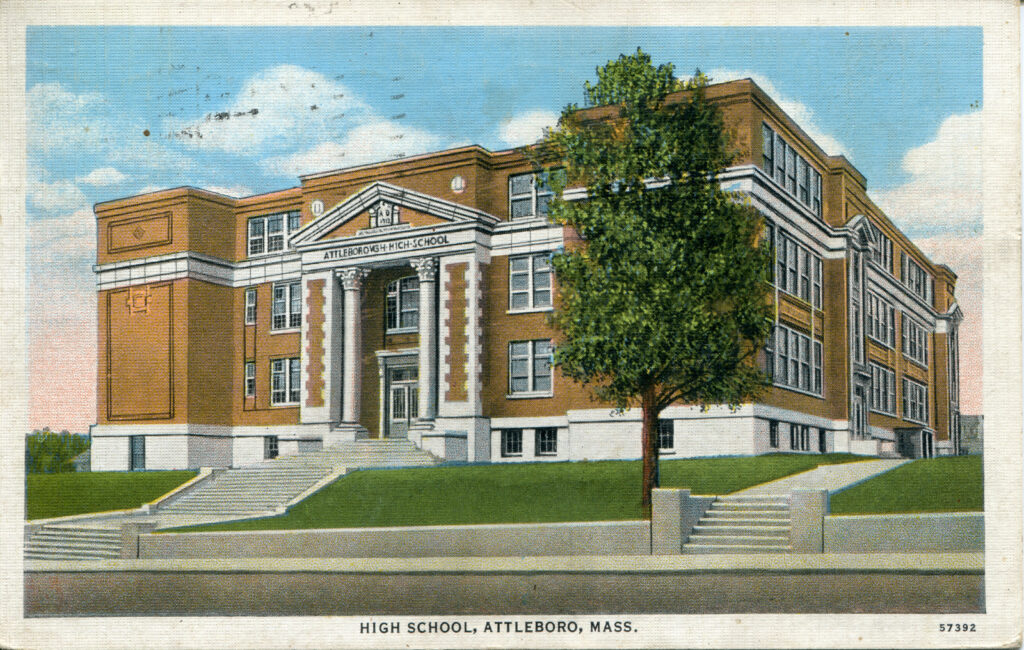 Context: Main Image: The postcard features a colorized illustration of the High School in Attleboro, Massachusetts.