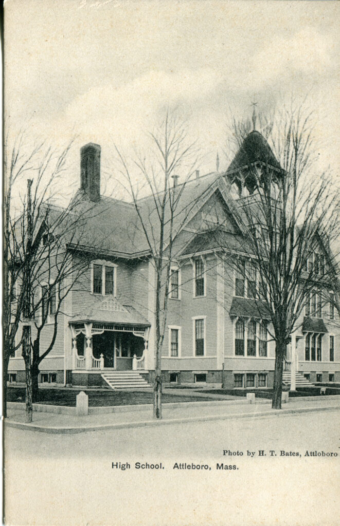 Context: Main Image: The postcard features a black-and-white photograph of the High School in Attleboro, Massachusetts, from the early 20th century.