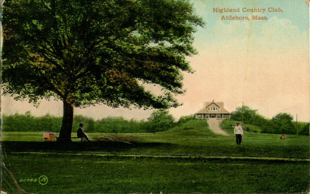 • The text on the postcard reads “Highland Country Club, Attleboro, Mass.” in the top right corner, clearly identifying the location.