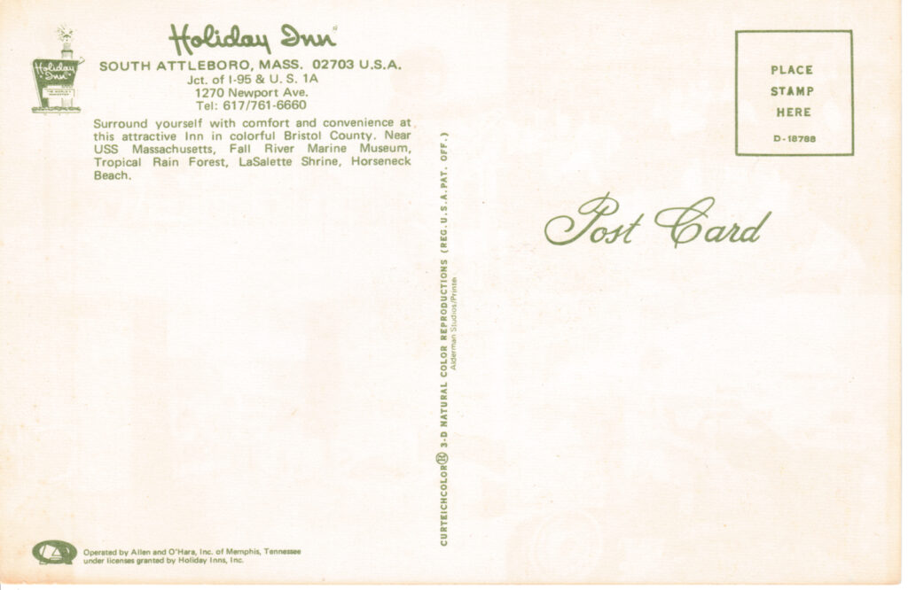 - The postcard effectively communicates the amenities and welcoming nature of the Holiday Inn in South Attleboro, Massachusetts. It showcases the dining, recreational, and accommodation facilities, making it an attractive choice for travelers looking for comfort and convenience.
