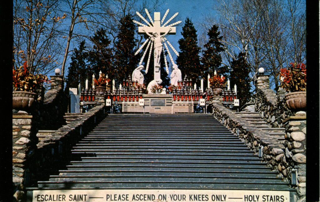 - At the base of the stairs, there is a sign that reads: “ESCALIER SAINT – PLEASE ASCEND ON YOUR KNEES ONLY — HOLY STAIRS.”