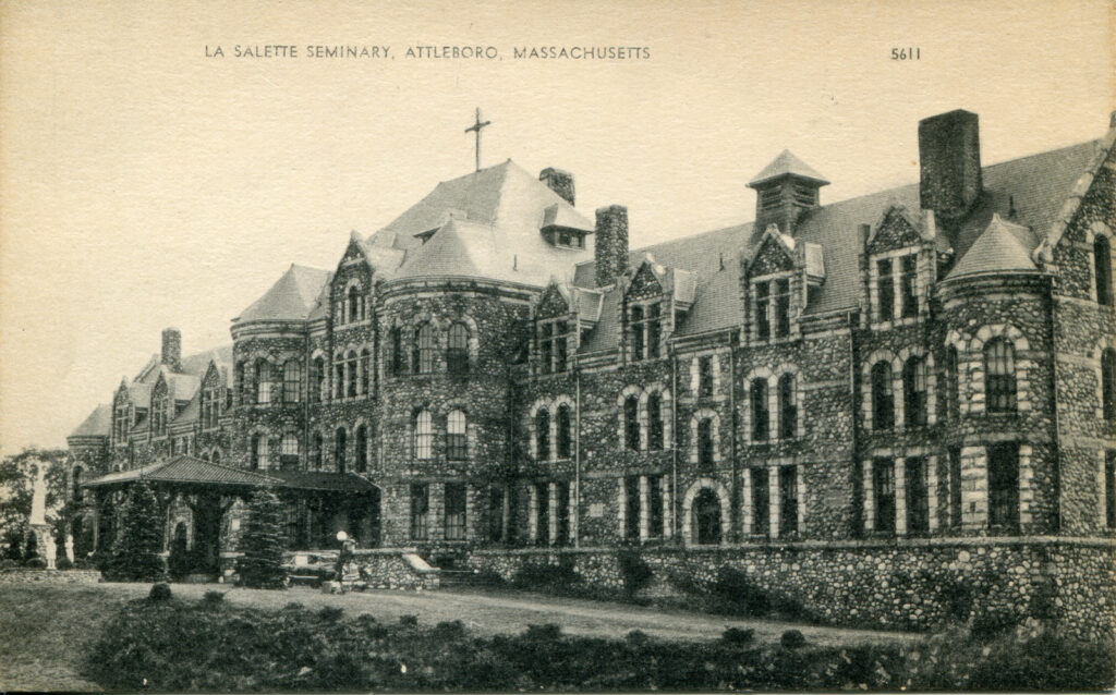 - The top of the postcard reads: “LA SALETTE SEMINARY, ATTLEBORO, MASSACHUSETTS”