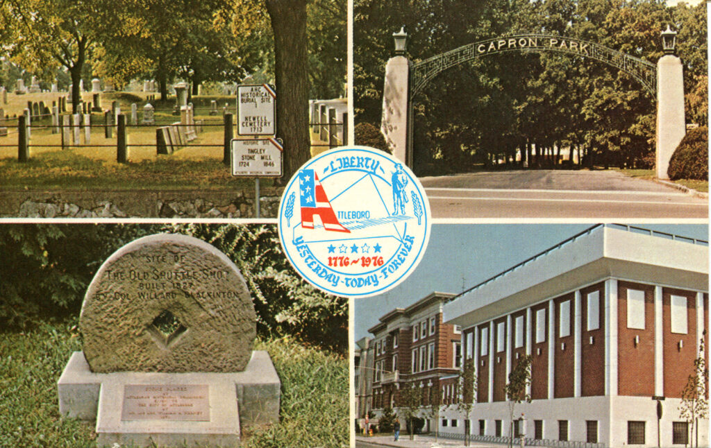 Main Image: This postcard is a collage of four different images representing historical and notable sites in Attleboro, Massachusetts. The central theme celebrates the bicentennial of American independence, marked by the emblem in the middle of the postcard.