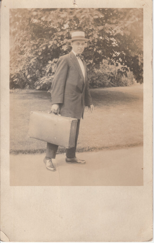 Main Image: The postcard features a sepia-toned photograph of a man standing outdoors on a paved path. He is dressed in a formal suit, complete with a bow tie and a straw boater hat. The man carries a large, vintage suitcase in his right hand and gazes directly at the camera.