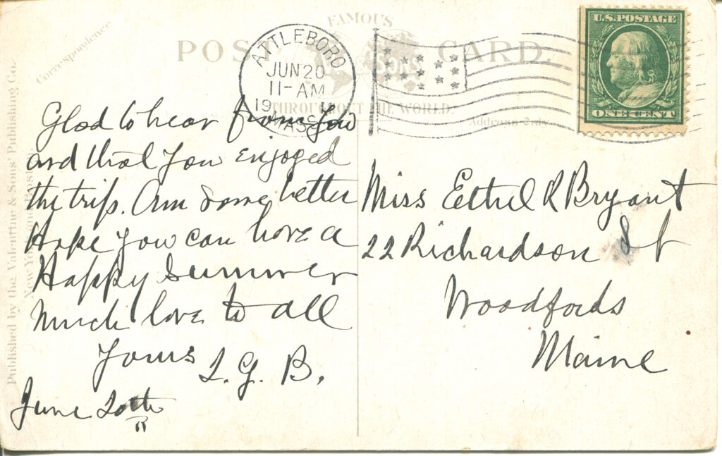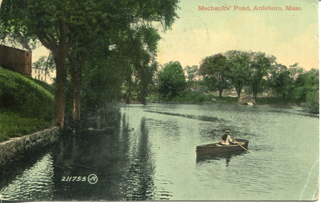 Context: Main Image: The postcard features a tranquil view of Mechanics’ Pond in Attleboro, Massachusetts.
