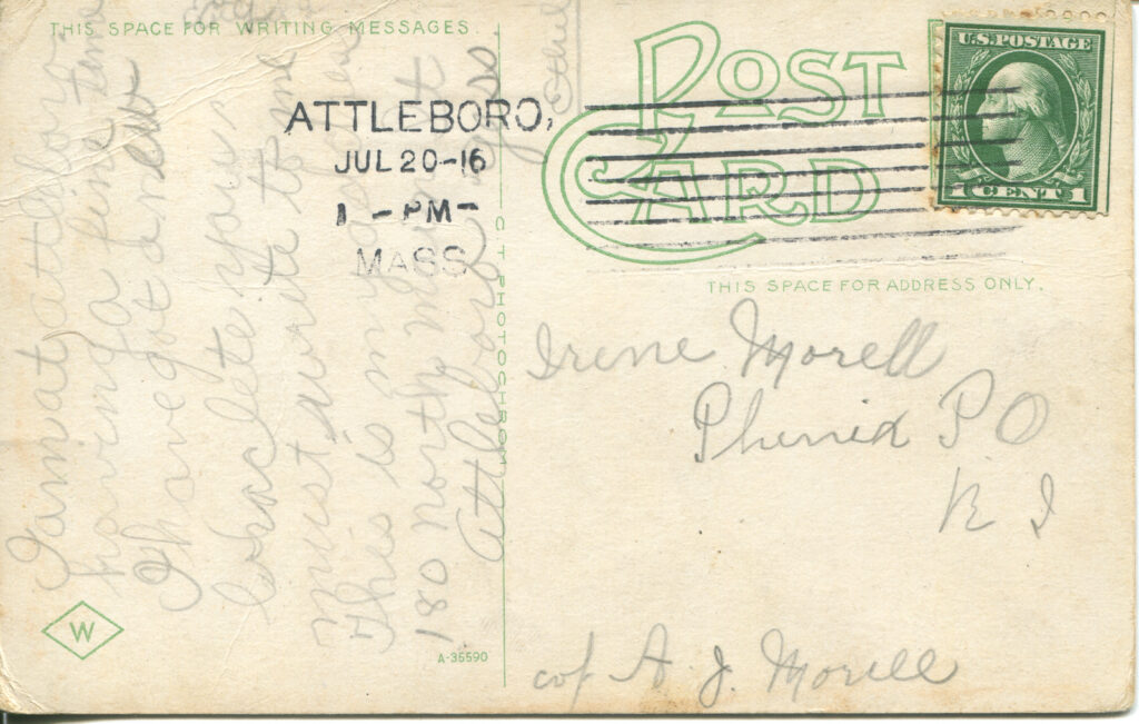 I am at Attleboro having a fine time. I’ve got a new bracelet. Youmust write to me.This is my address:180 North Main St. Attleboro Mass.”