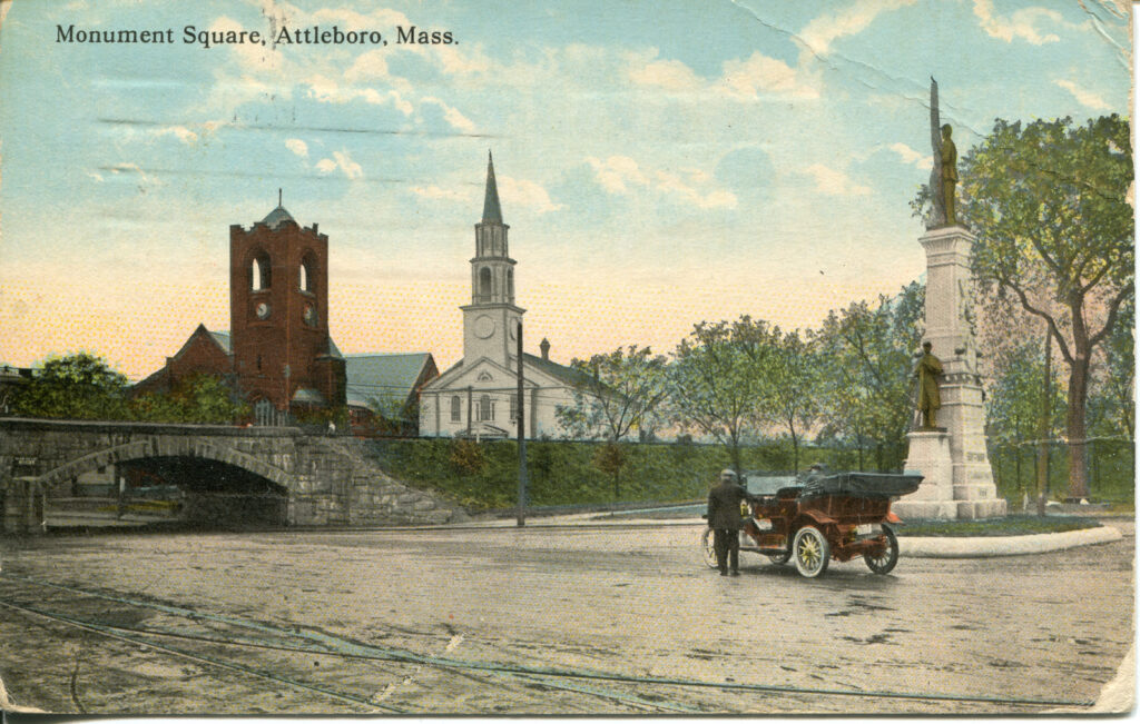 - The top of the postcard reads “Monument Square, Attleboro, Mass.” in black text.