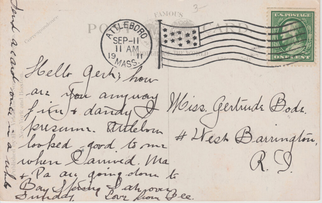 Hello Gert; how are you anyway fine + dandy I presume. Attleboro looked good to me when I arrived. Ma + Pa are going down to Bay Street I suppose Sunday. Love from Bee.