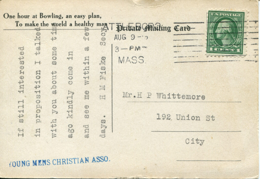 • Illustration: The postcard features a colorful illustration with a group of men engaging in a bowling activity inside a room. The scene includes a bowling score sheet in the background and another man playing billiards.