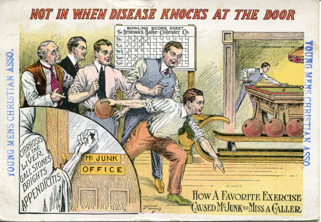 • Theme: The postcard appears to be promoting the health benefits of physical exercise, specifically bowling, as a means of avoiding diseases and promoting well-being.