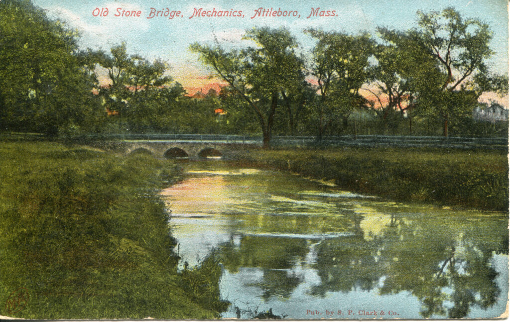 - The text at the top reads “Old Stone Bridge, Mechanics, Attleboro, Mass.”