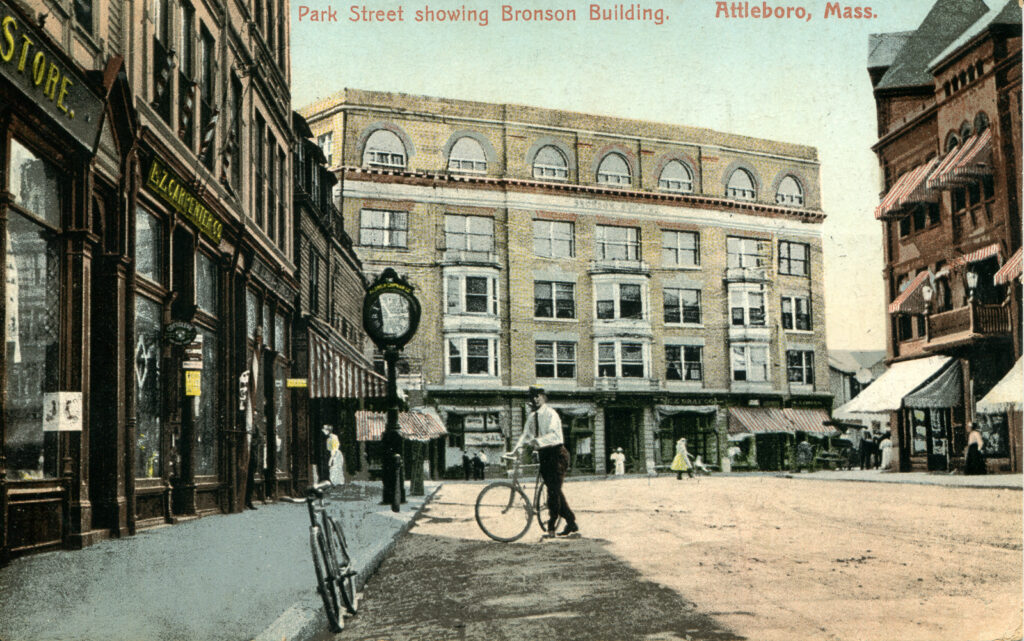 Context: Main Image: The postcard presents a vivid scene of Park Street in Attleboro, Massachusetts, prominently featuring the Bronson Building.