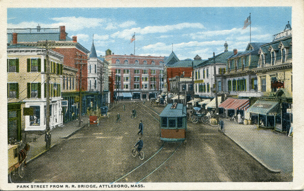 - The text at the bottom reads, “PARK STREET FROM R. R. BRIDGE, ATTLEBORO, MASS.”