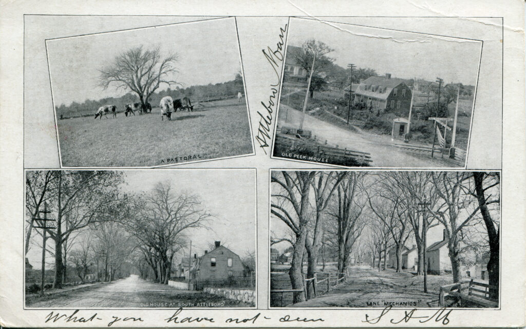 - Main Image: This postcard features a collage of four different black and white images, each depicting a different scene in Attleboro.