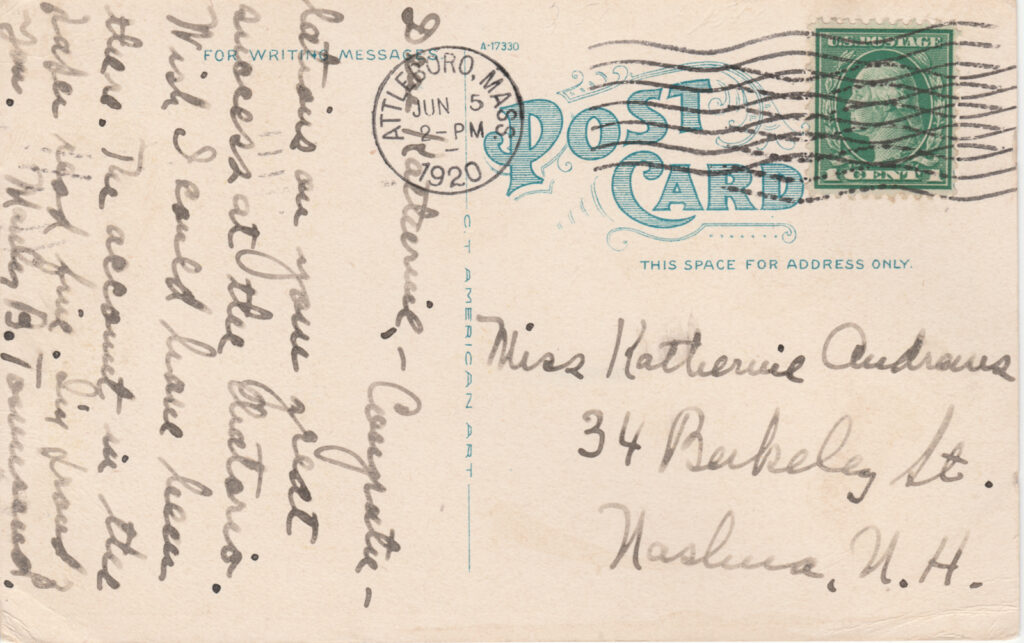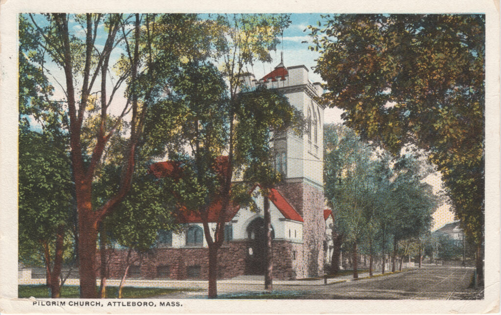- The bottom left corner of the postcard reads “PILGRIM CHURCH, ATTLEBORO, MASS.”