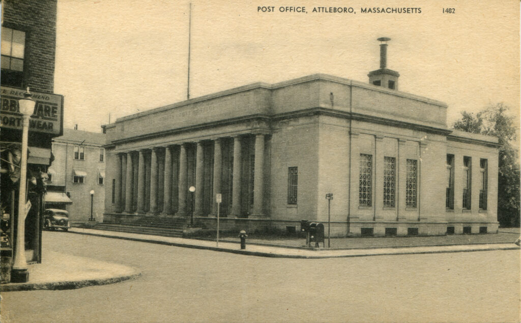Context: This postcard depicts the U.S. Post Office in Attleboro, Massachusetts. The image is in sepia tones, giving it a vintage feel, and captures the building from a slightly different angle compared to previous postcards.
