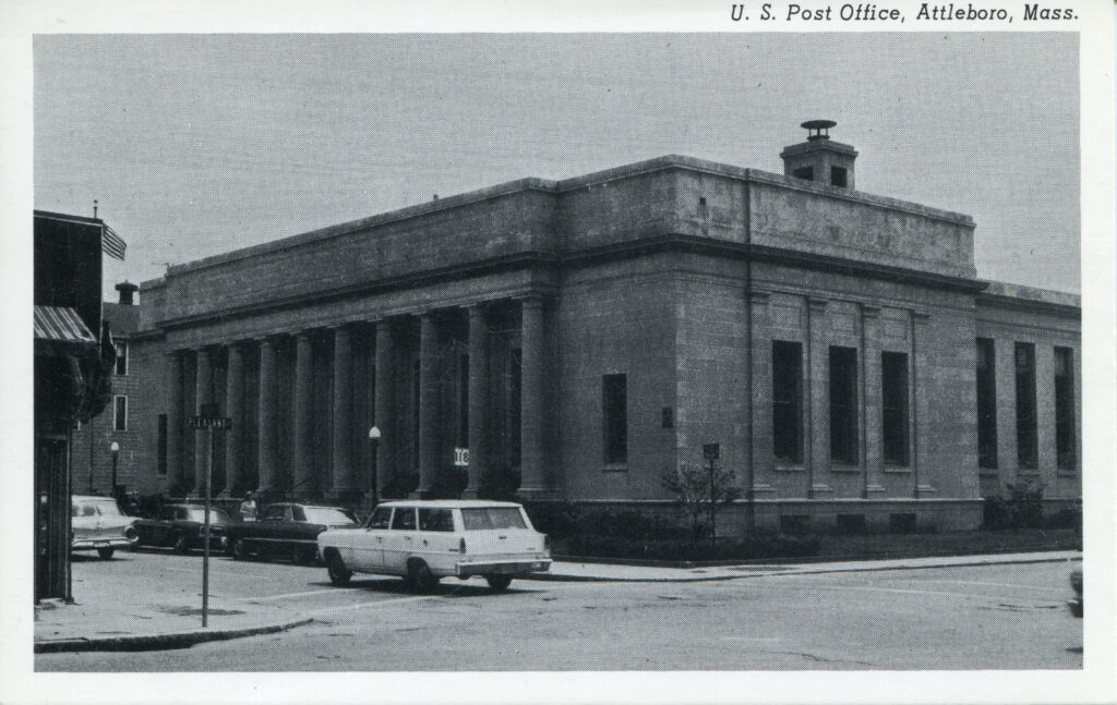This postcard highlights the historic and architectural significance of the U.S. Post Office in Attleboro, showcasing its role as a central and prominent building in the community.