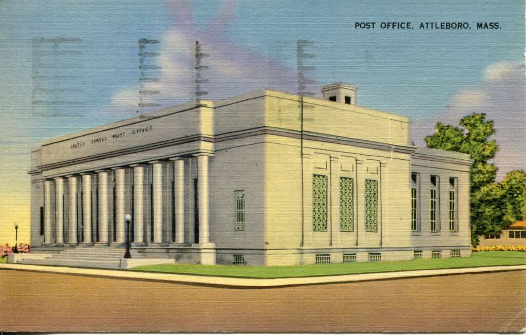 Overall, this postcard showcases the U.S. Post Office as a prominent and important building in Attleboro, reflecting its significance in the community.