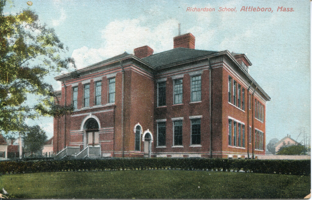 Context: Main Image: The postcard features a color-tinted photograph of Richardson School in Attleboro, Massachusetts, from the early 20th century.