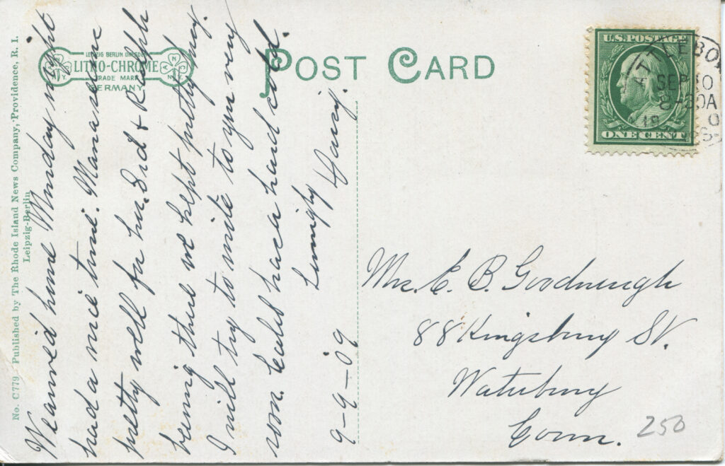 - The right margin of the postcard contains handwritten notes with the date “9-9-09,” providing a historical context and personal touch.