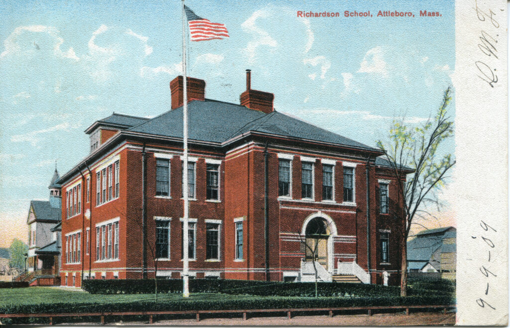 Context: Main Image: The postcard features a color-tinted photograph of Richardson School in Attleboro, Massachusetts, from the early 20th century.