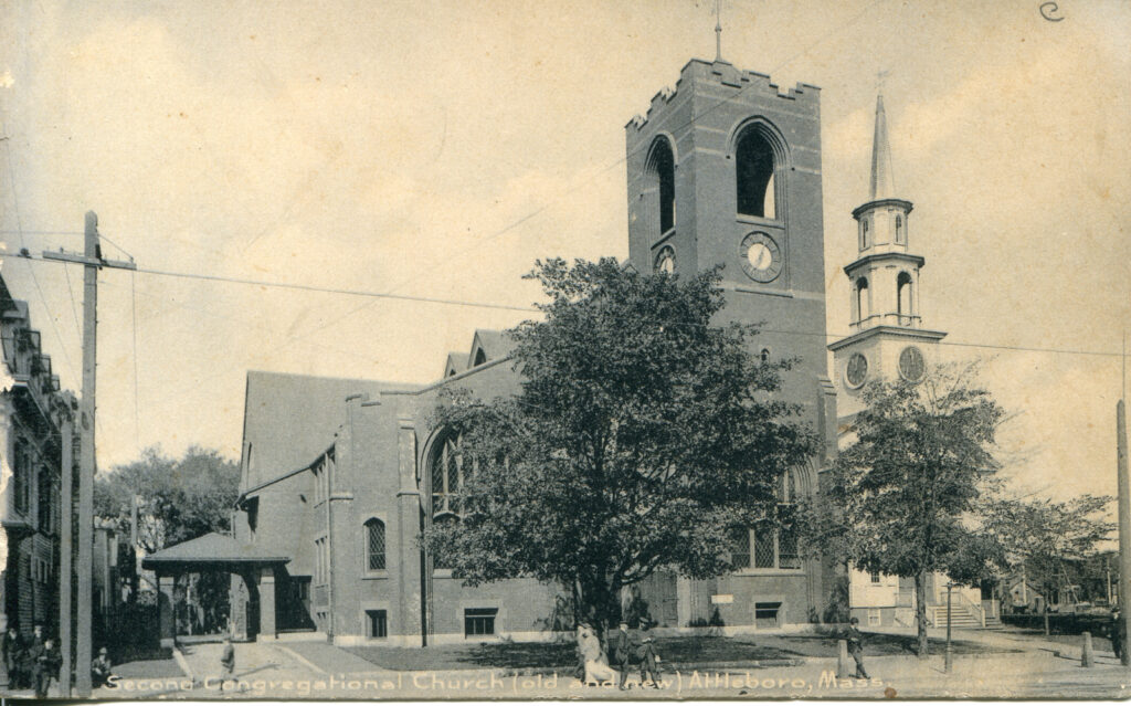 - The bottom of the postcard is labeled with: “Second Congregational Church (old and new) Attleboro, Mass.”