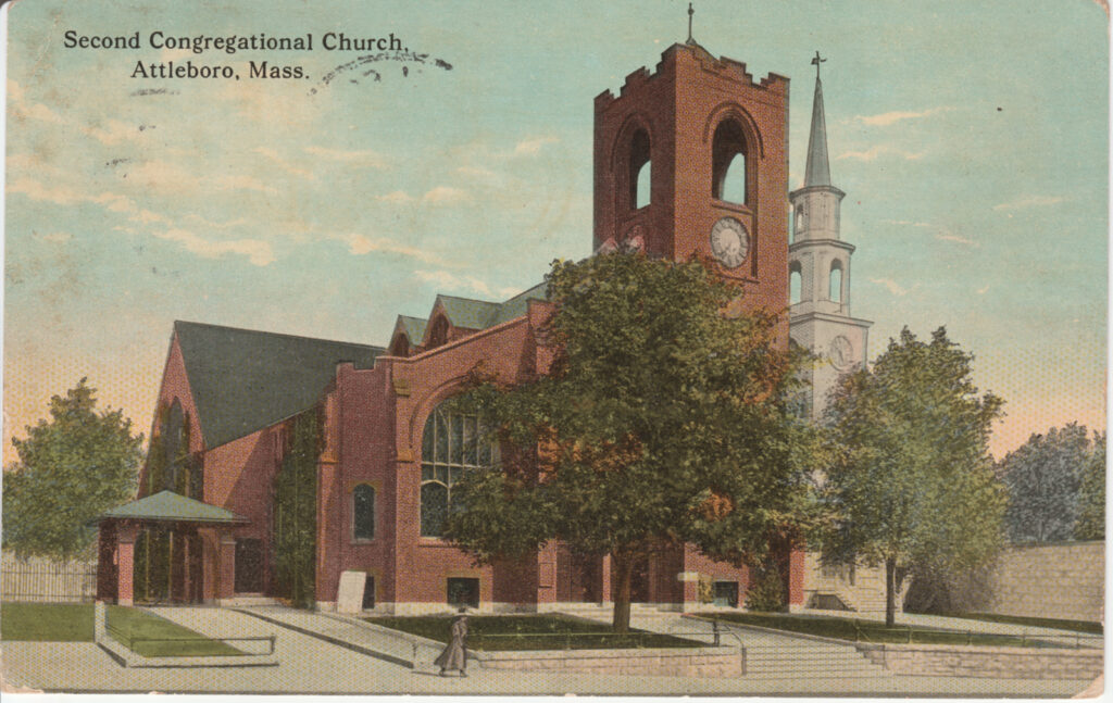 - The top of the postcard is labeled with: “Second Congregational Church, Attleboro, Mass.”