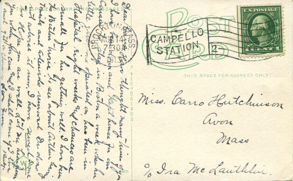 Have thought many times of you and felt hurt for not writing. Christian is in Boston a week where he was operated on for an abscess in his ear. Clarence came up all right. Well I have been getting meals for him and Don’t Arthur bring the twins and ailine’s around on close to run. I have been there twice. Hope you are well. Did Mrs. Latham go play the can and I shall come if you go far from here.