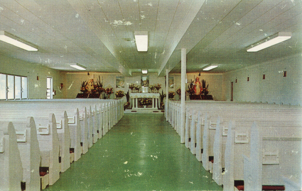 Context: Main Image: The postcard shows the interior of a church or chapel, highlighting the central aisle and the altar.