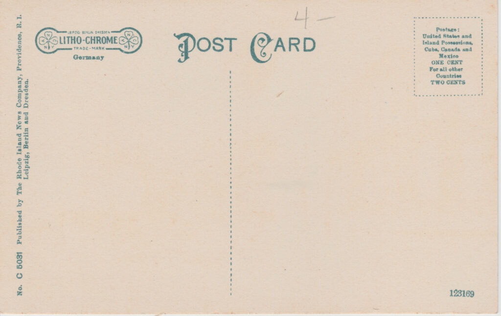 - The postcard is colored, with the red-brick building and the light sky creating a contrast.