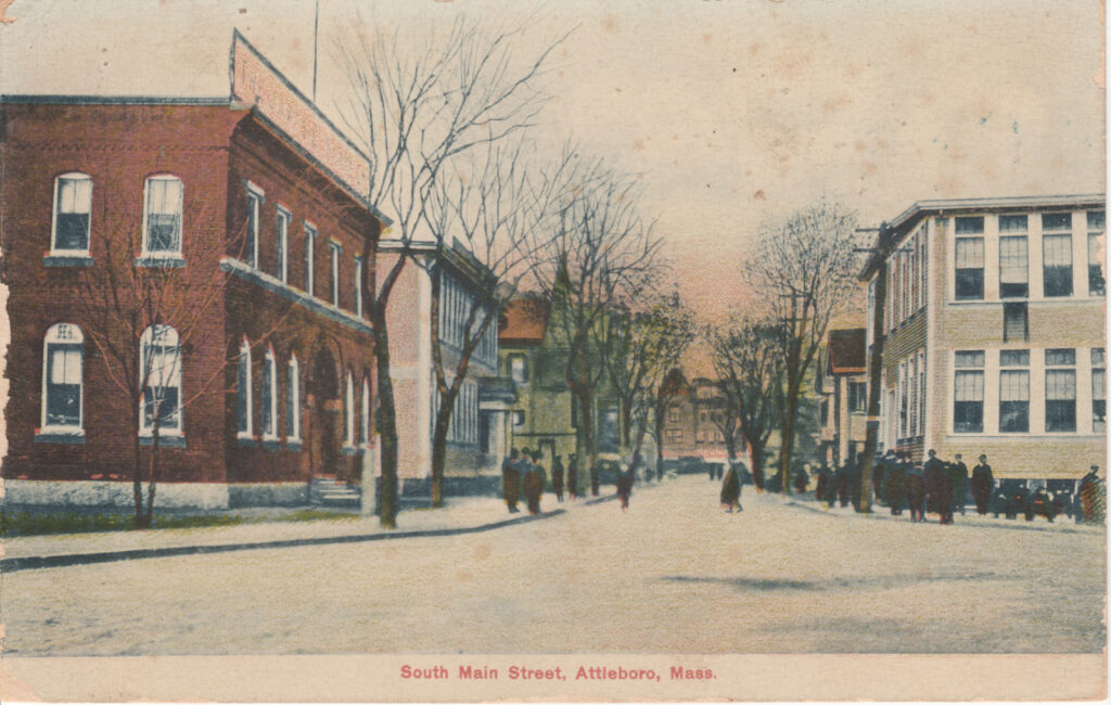 - The caption “South Main Street, Attleboro, Mass.” is centered at the bottom of the postcard.