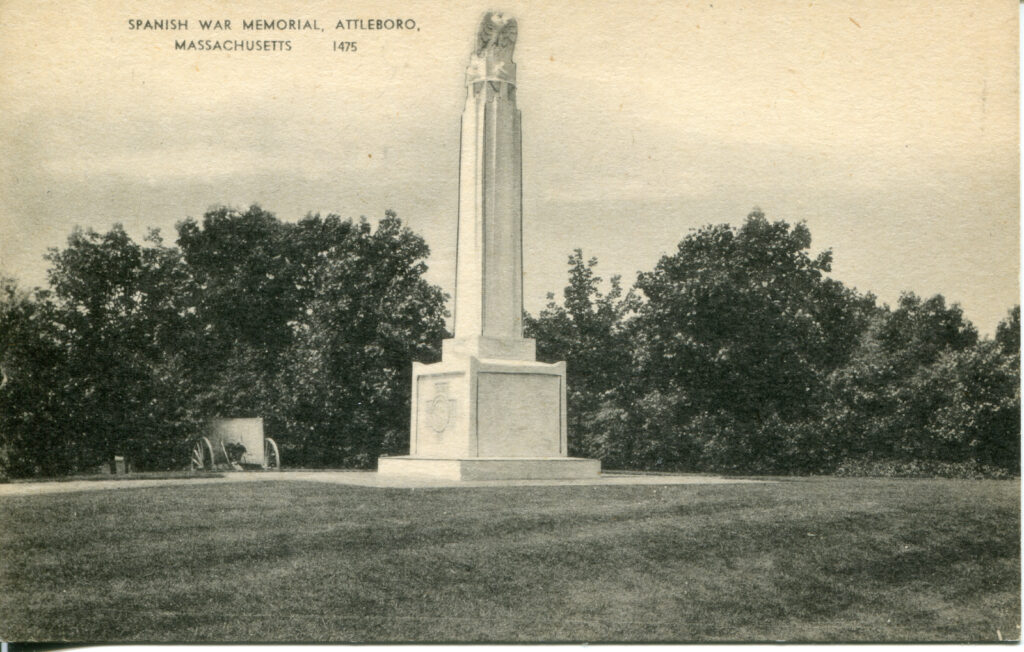 Context: Main Image: The postcard features a black and white image of the Spanish War Memorial in Attleboro, Massachusetts.