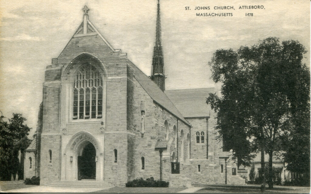- The top right of the postcard reads: “ST. JOHNS CHURCH, ATTLEBORO, MASSACHUSETTS.”