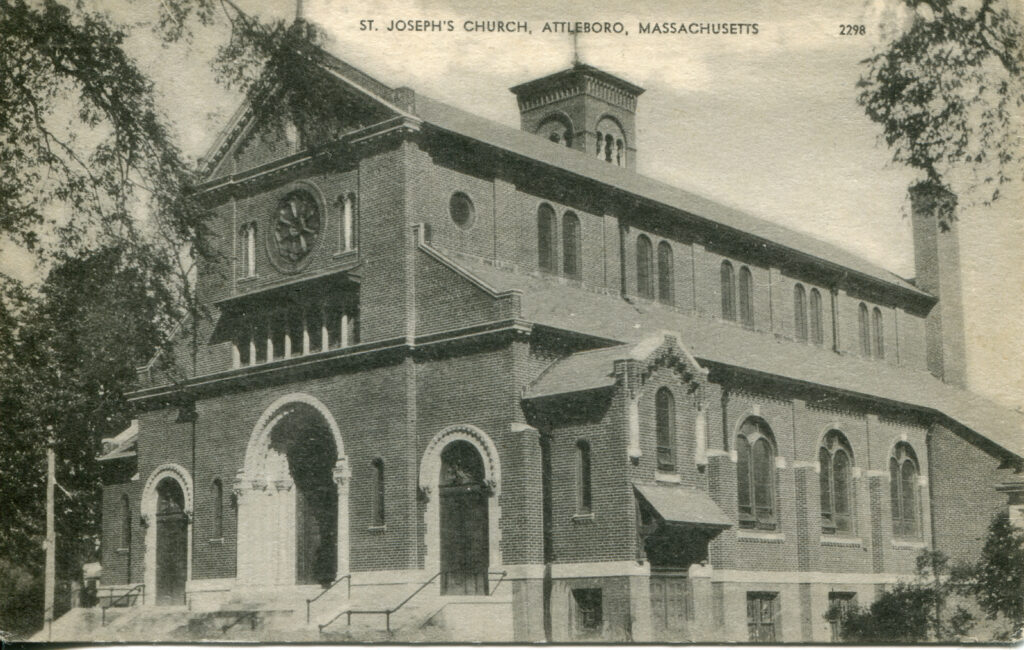 Context: Main Image: The postcard features a black and white photograph of St. Joseph’s Church in Attleboro, Massachusetts.