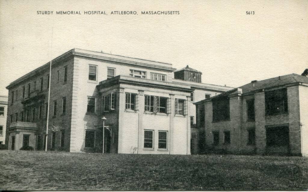 - Caption: The caption at the top of the postcard reads “STURDY MEMORIAL HOSPITAL, ATTLEBORO, MASSACHUSETTS.”