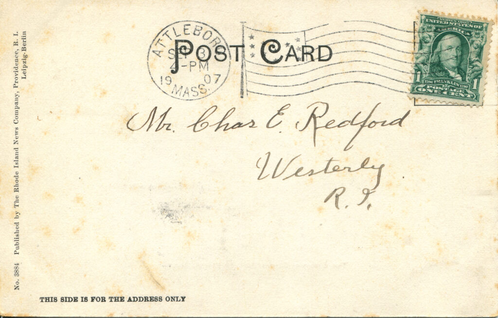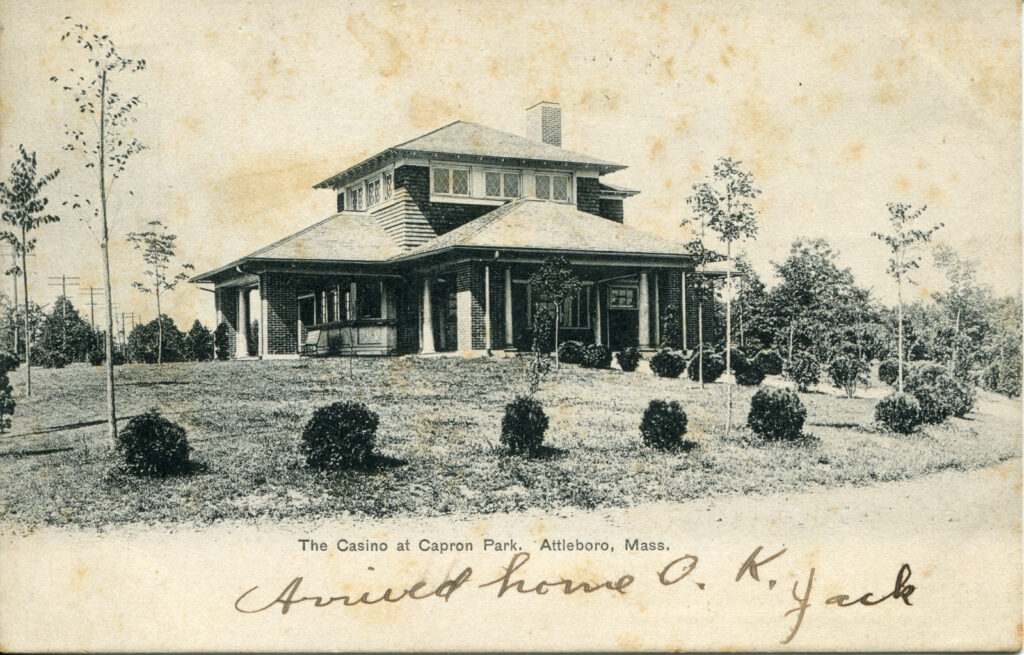 Context: Main Image: The postcard features a black and white photograph of the Casino at Capron Park in Attleboro, Massachusetts.