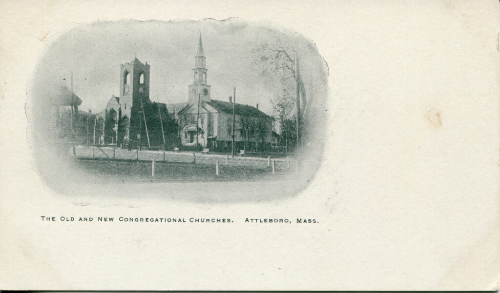 - The printed text on the postcard reads: “THE OLD AND NEW CONGREGATIONAL CHURCHES. ATTLEBORO, MASS.”