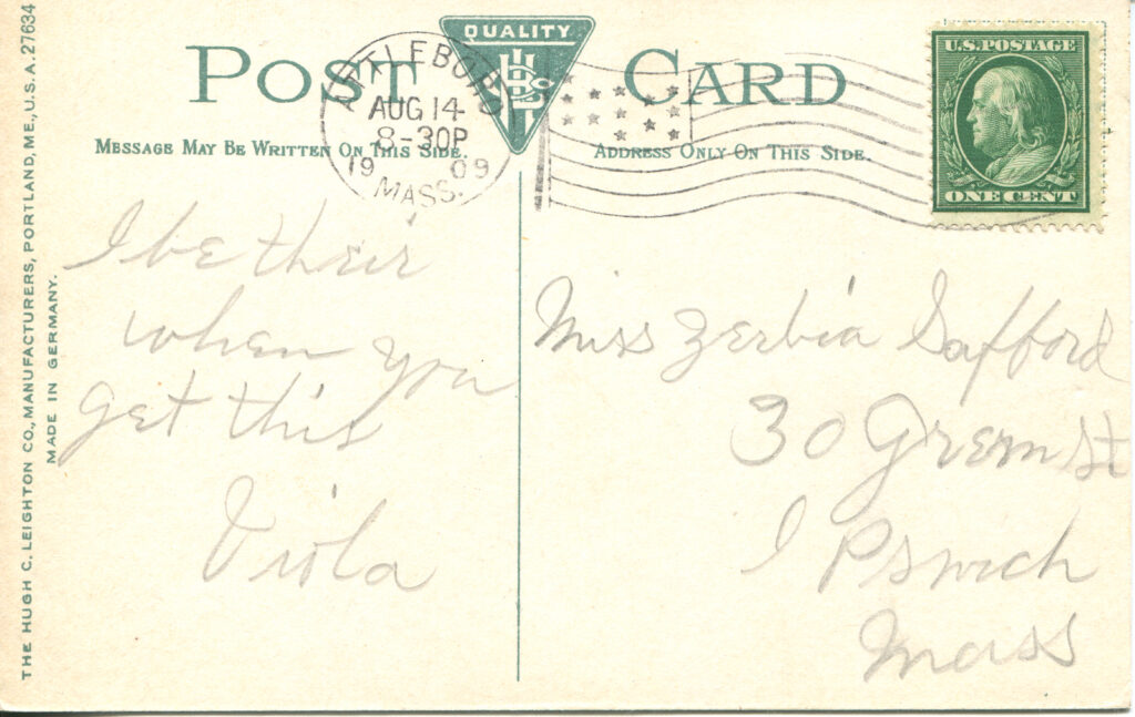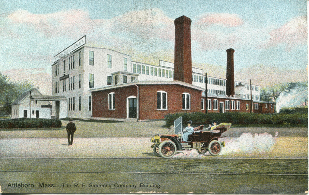 - The bottom of the postcard reads “Attleboro, Mass. The R. F. Simmons Company Building.” in clear text.