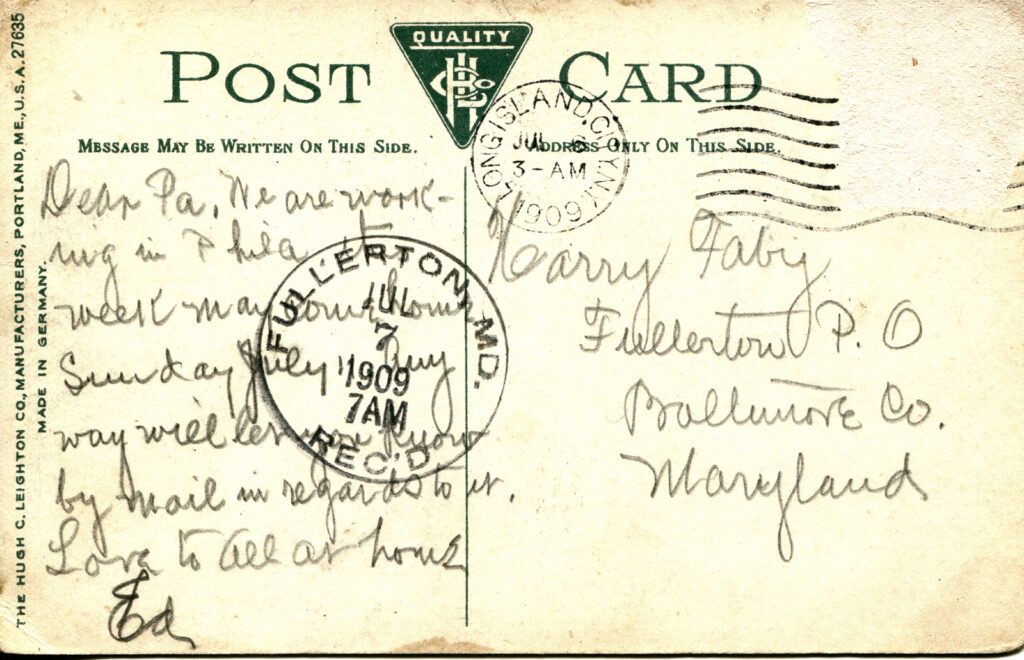 Dear Pa, We are working in Phila. and expect to be through by Sunday next. We are all very well and hoping to hear from you by mail in regards to our love to all at home.