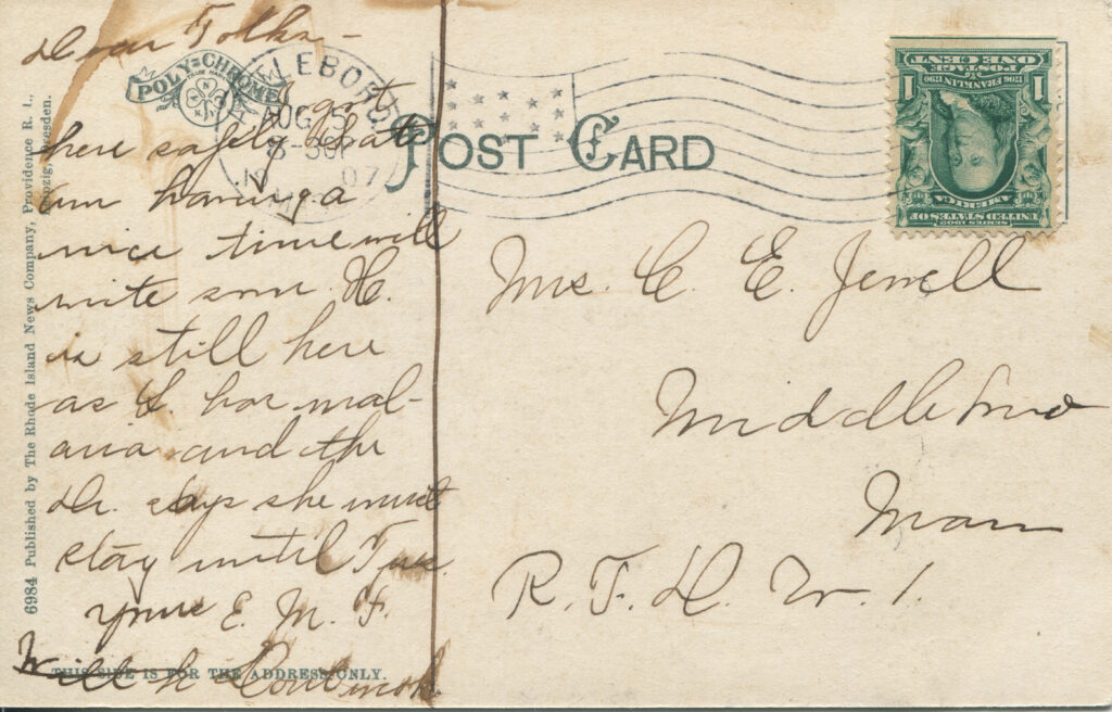 I got here safely Saturday, am having a nice time, will write soon. E. is still here as he has malaria, and the Dr. says she must stay until Tues.