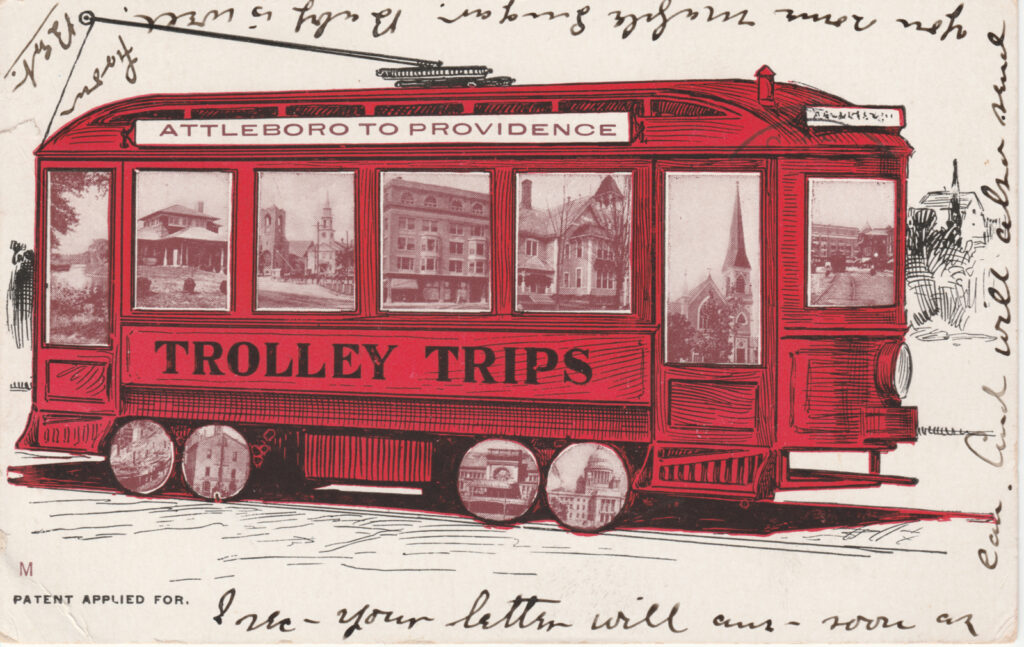 Main Image: The postcard features an illustration of a red trolley car with the words “TROLLEY TRIPS” prominently displayed on the side. Above the windows of the trolley is a sign indicating the route: “ATTLEBORO TO PROVIDENCE.”
