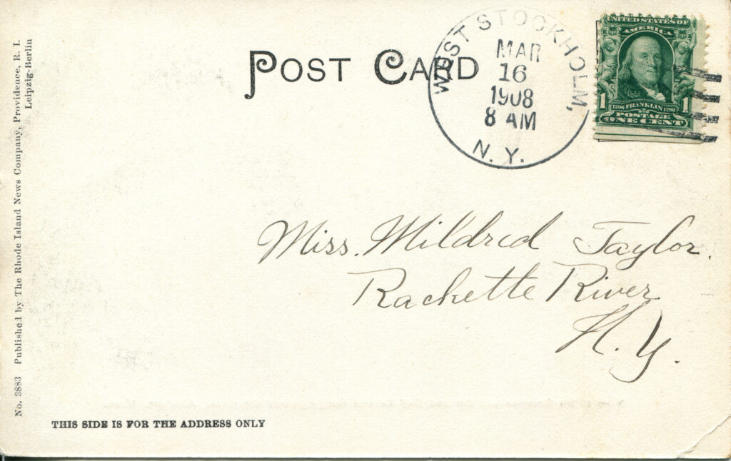 - Message: “All will hope you are the same. I will send you that type card in the near future. I am not going to the P.O. to work anymore. Don’t you think the a pretty scene? Yours truly.”
