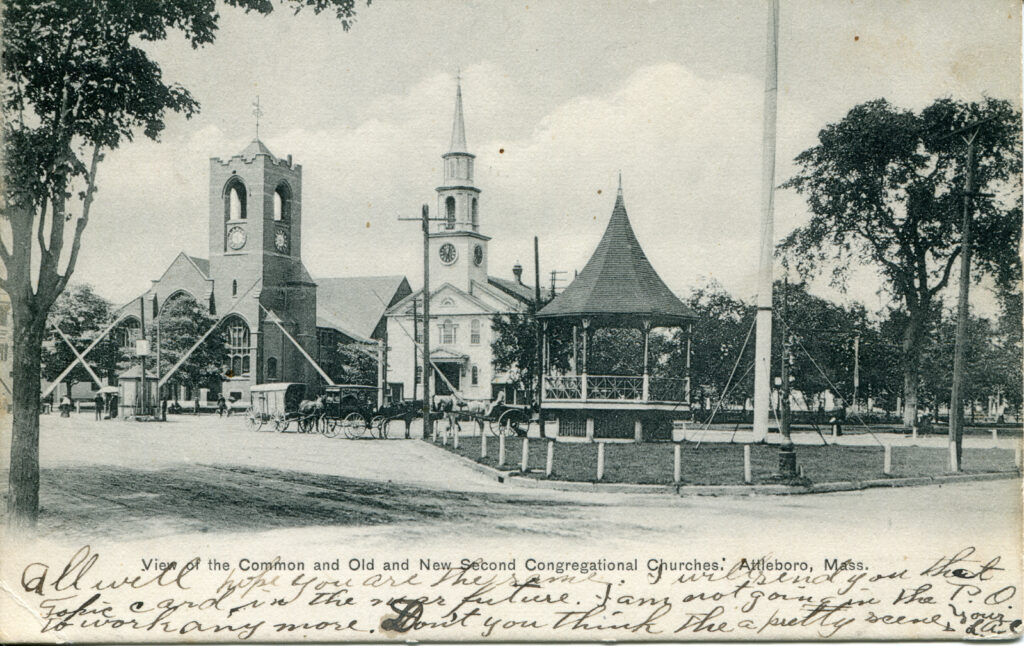 - The printed text on the postcard reads: “View of the Common and Old and New Second Congregational Churches: Attleboro, Mass.”