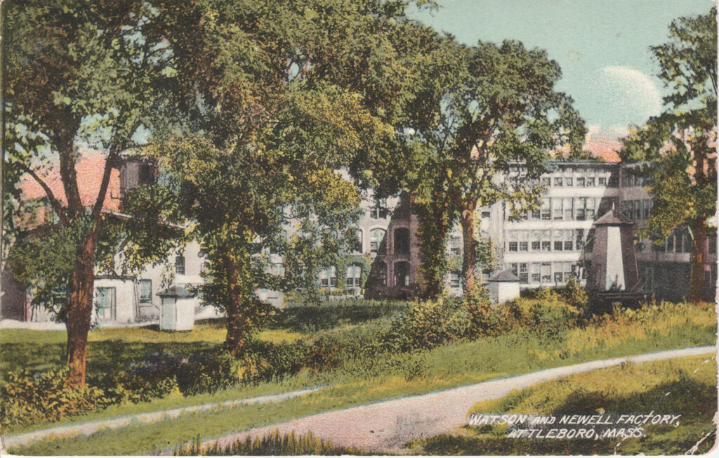 Context: Main Image: The postcard depicts the Watson and Newell Factory in Attleboro, Massachusetts.